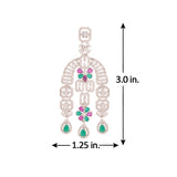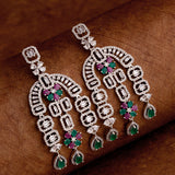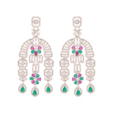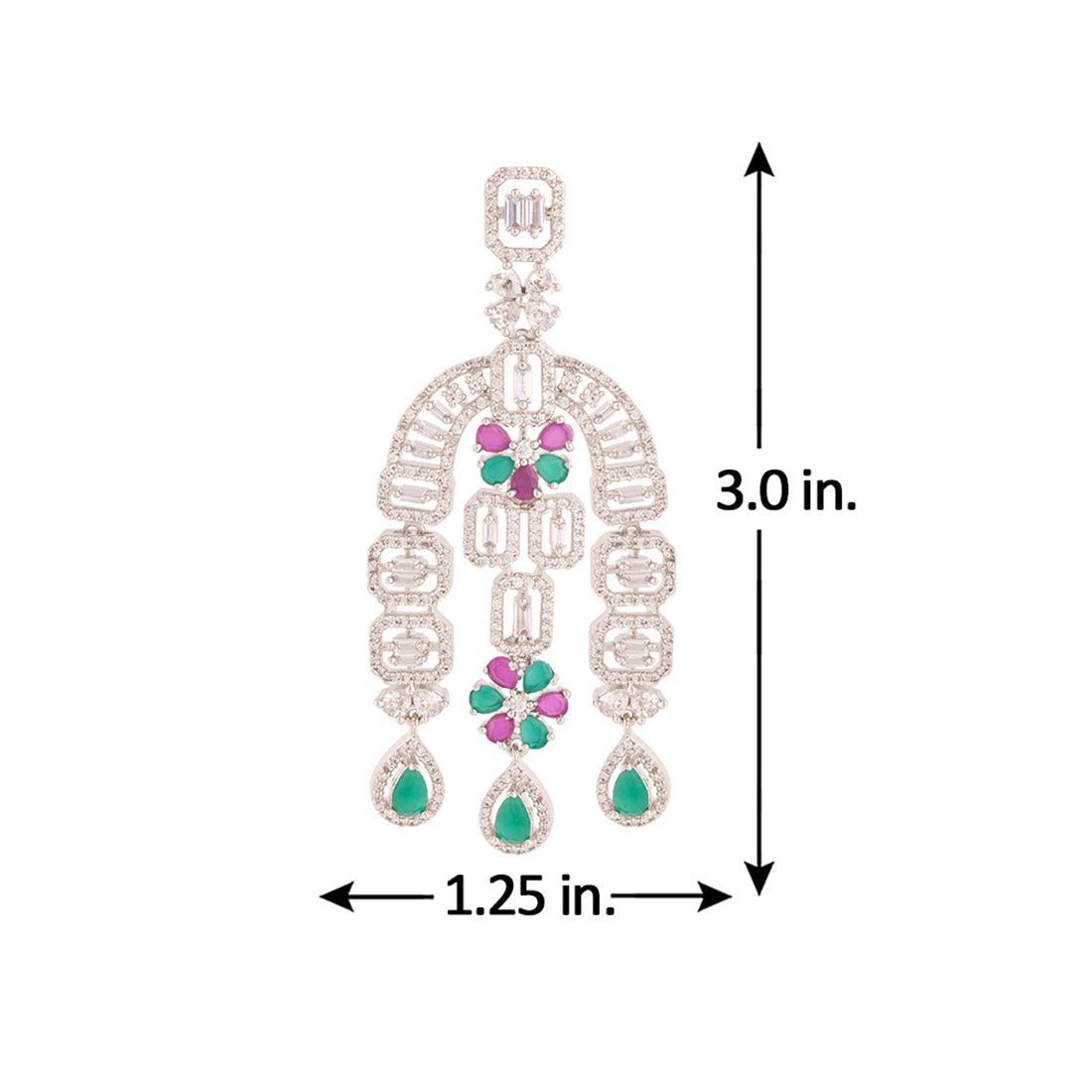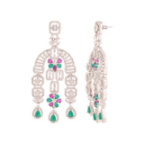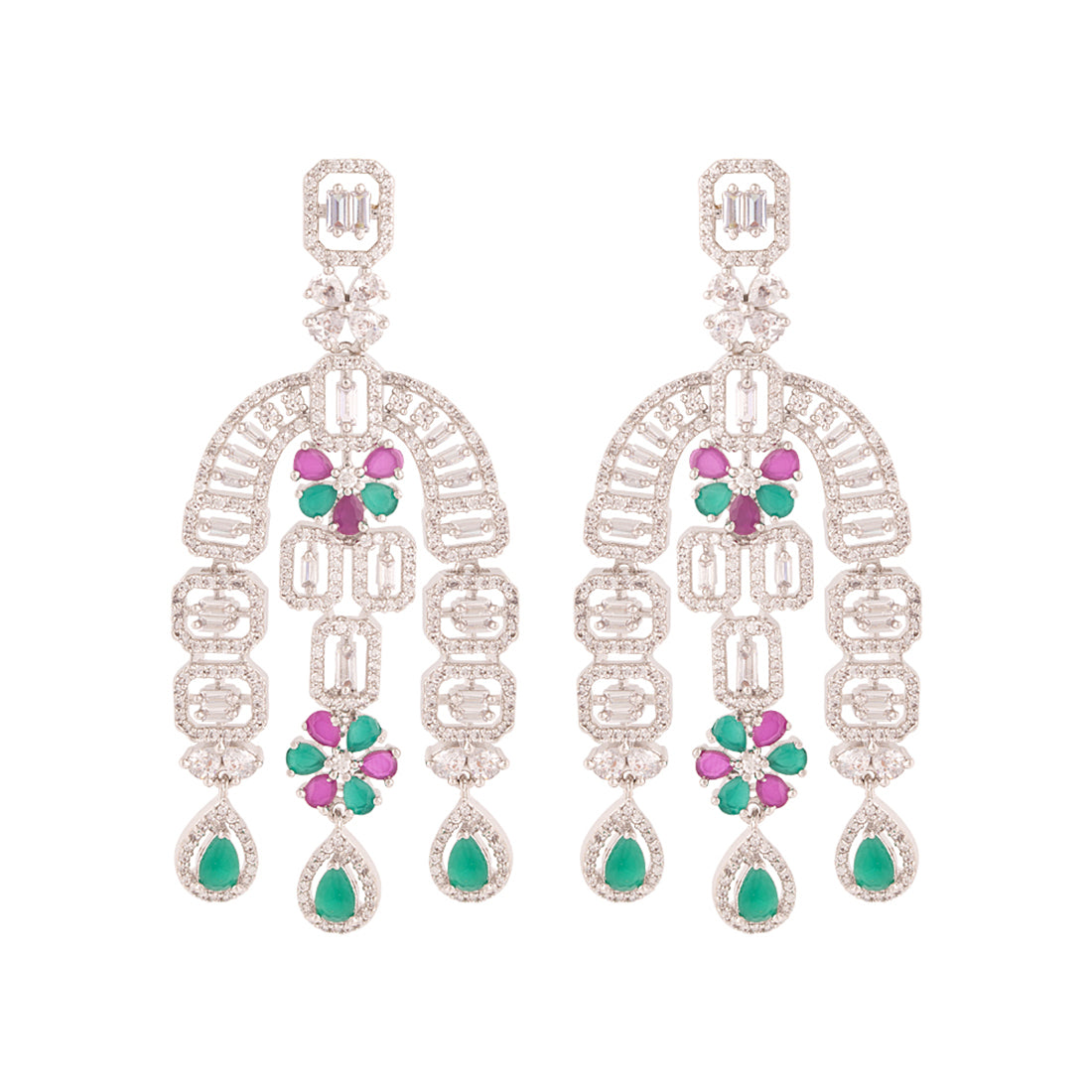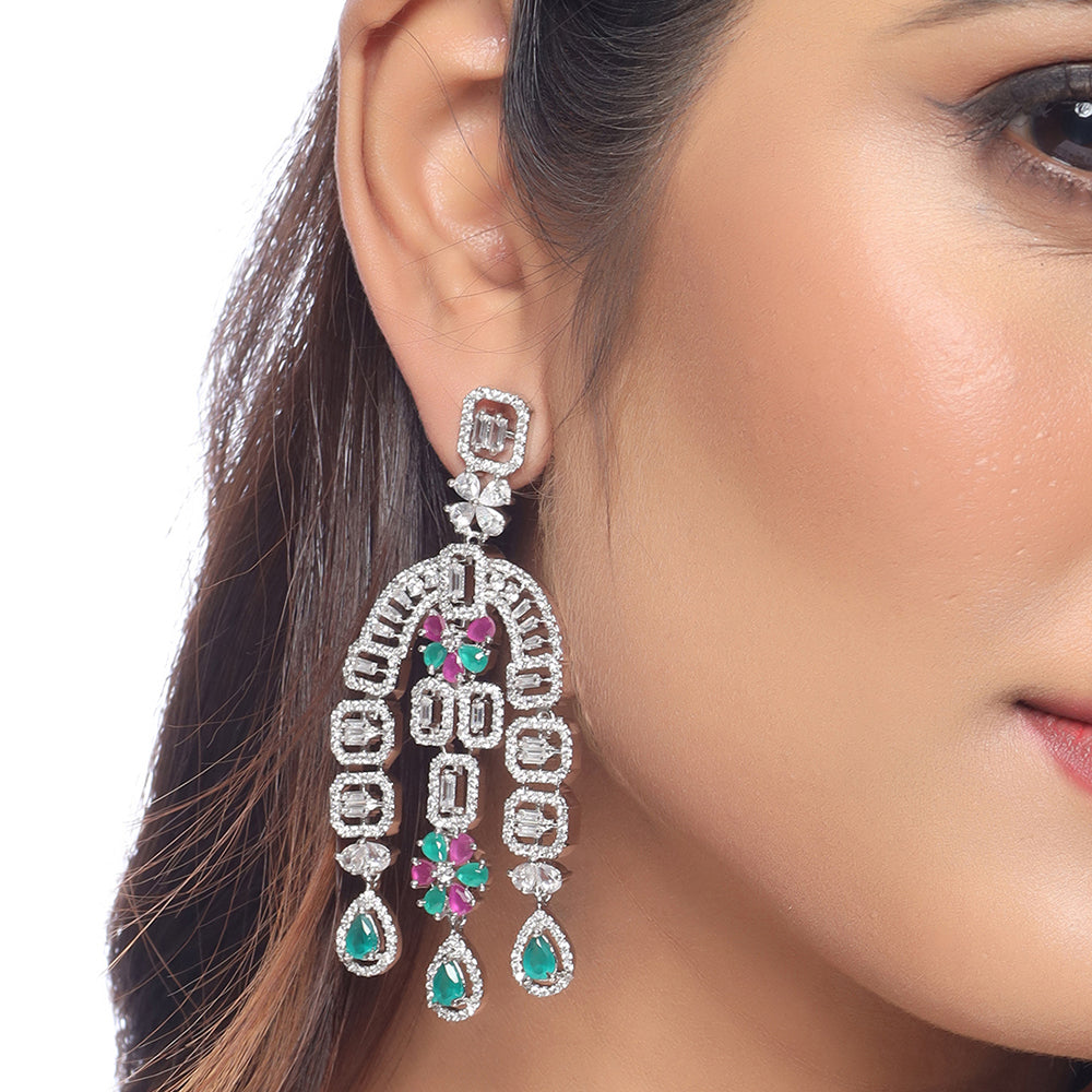 Chandelier earrings made from brass and embellished with coloured American Diamond gemstones. Silver plated and adorned with floral motifs. Wear with a trendy saree.