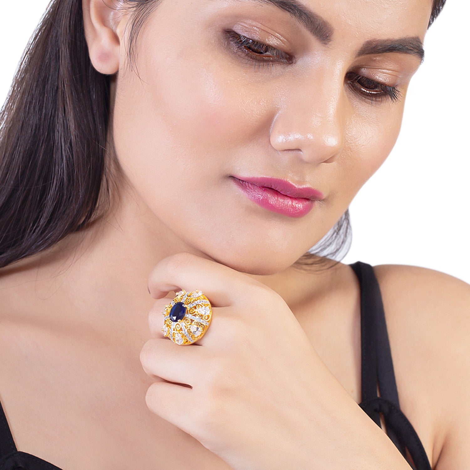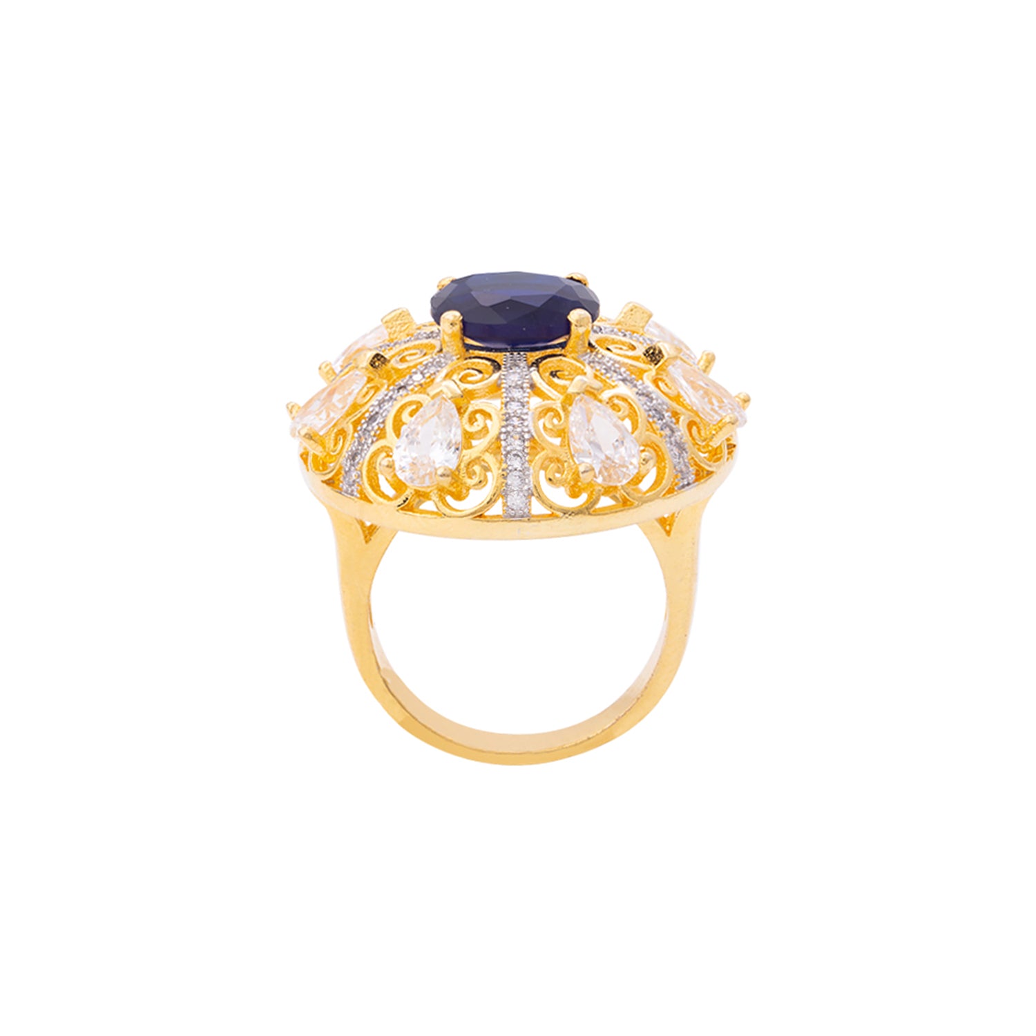 Zircons embellished cocktail ring made from brass. Two tone plated and good for formal looks. This piece of jewelry comes with the Voylla assurance of quality and durability.