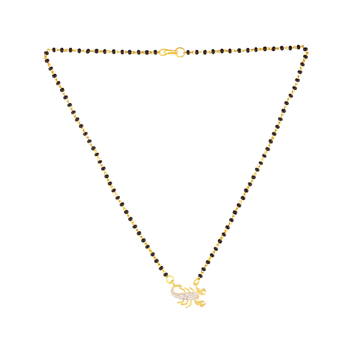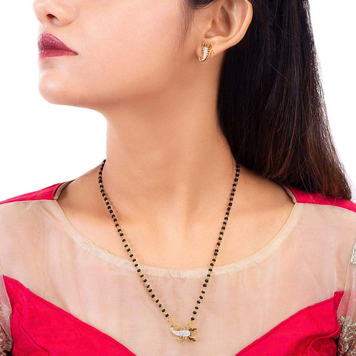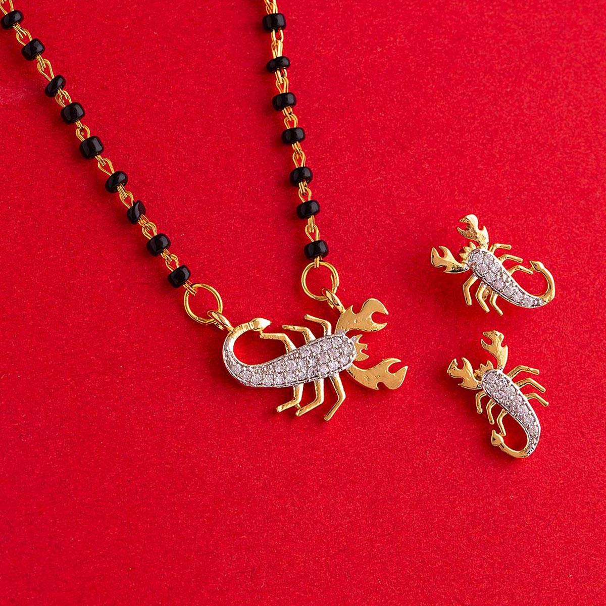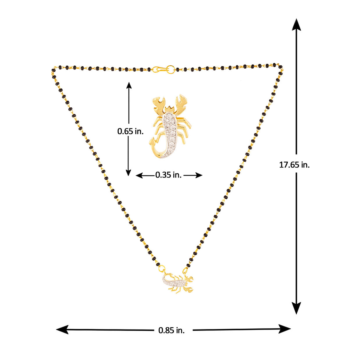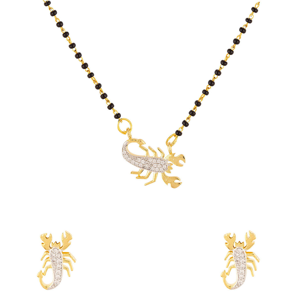 Scorpio zodiac sign American Diamond gems embellished mangalsutra with earrings. Made from brass and two tone plated. Pair with ethnic and Indo-Western looks. This piece of jewelry comes with the Voylla assurance of quality and durability.
