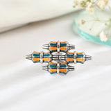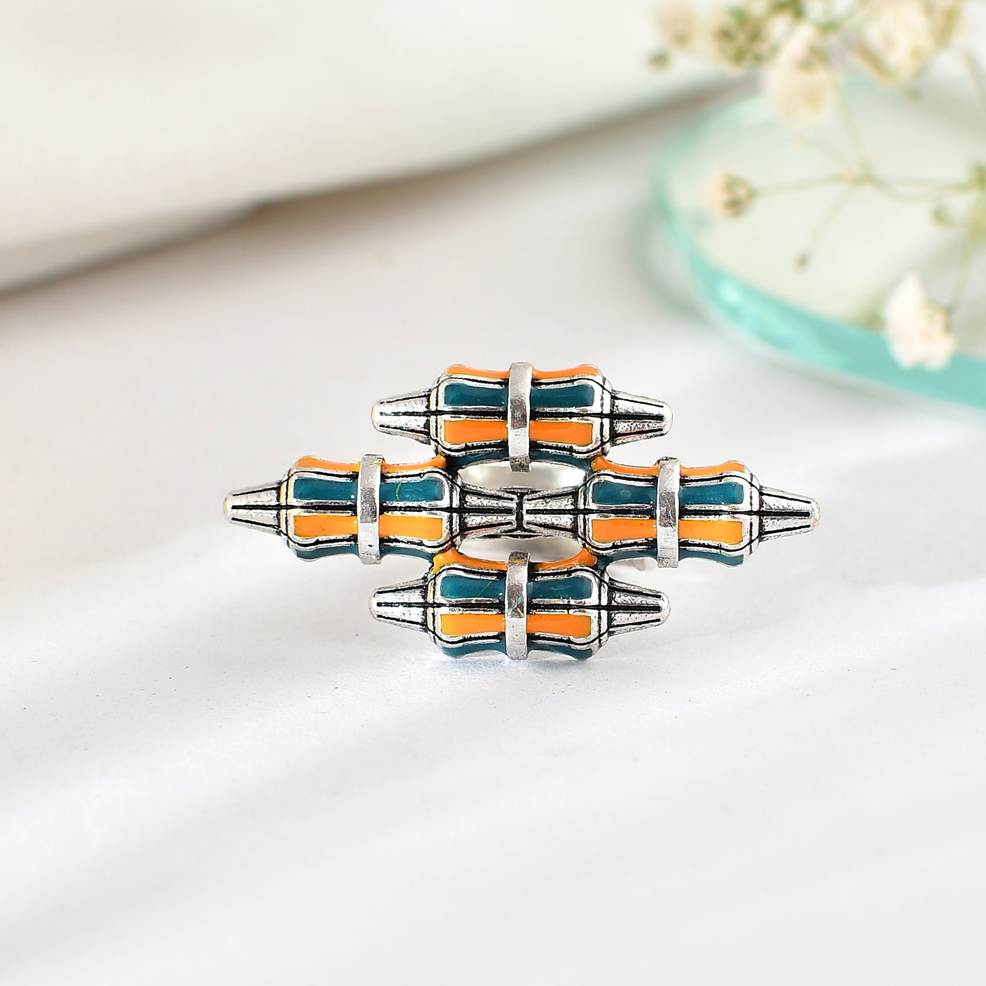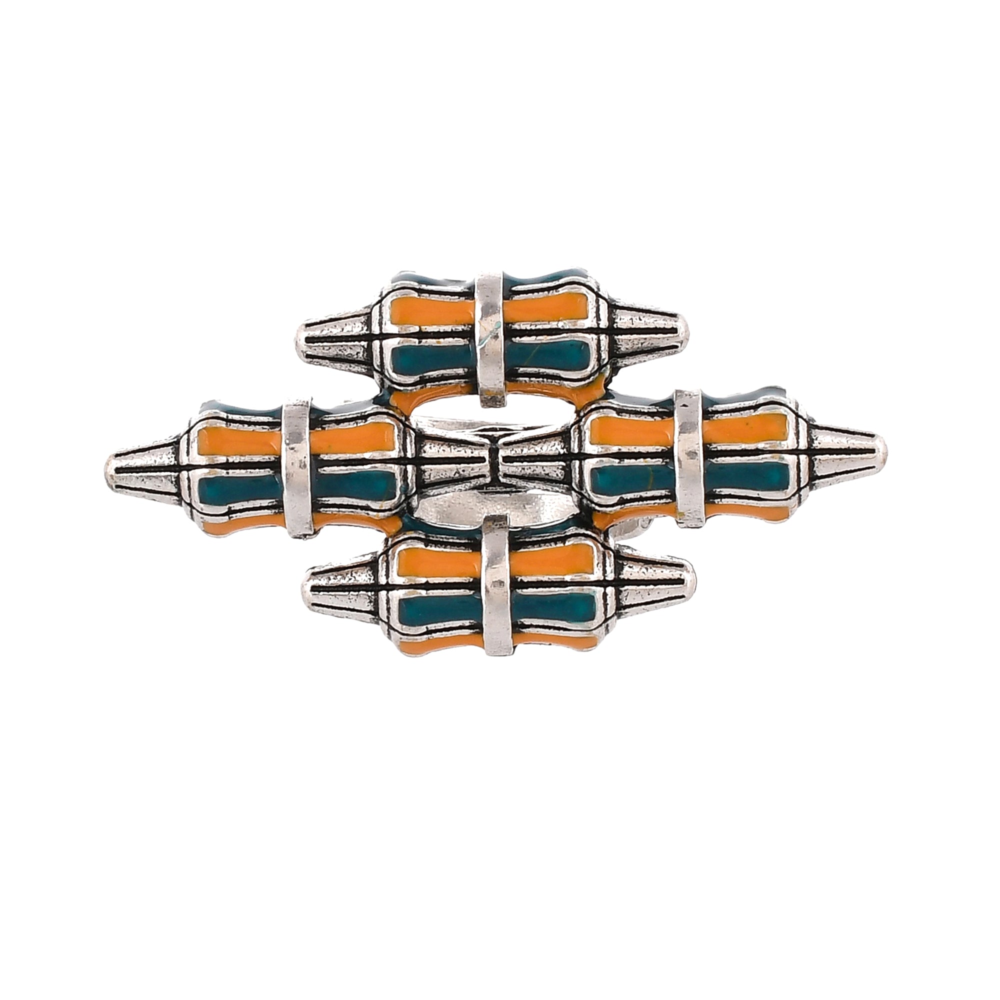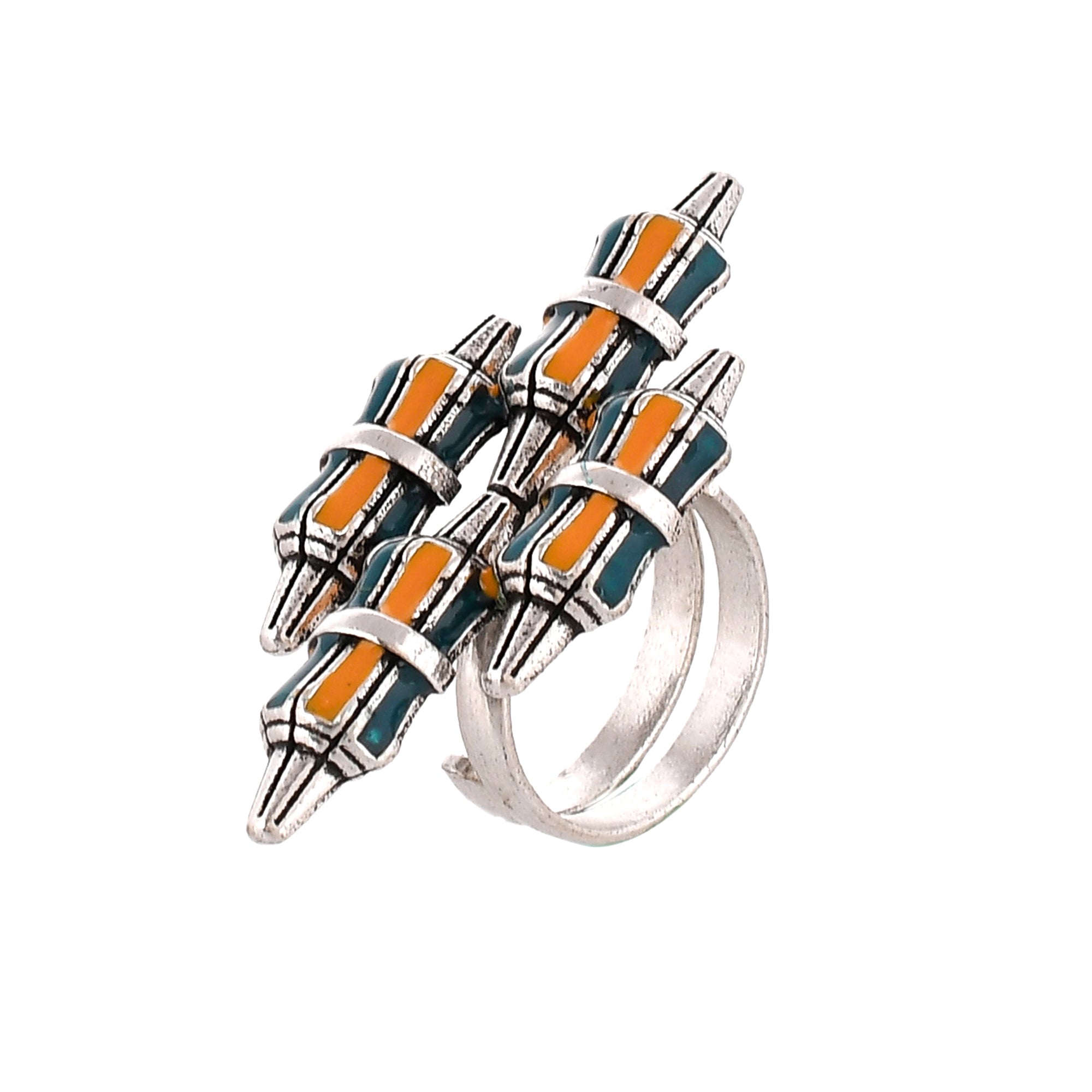 The African basket art of Zulu has inspired this contemporary design finger ring, which has been fashioned out of brass. Oxidized silver plating adds to the charm of this colorful and versatile piece.