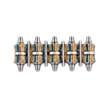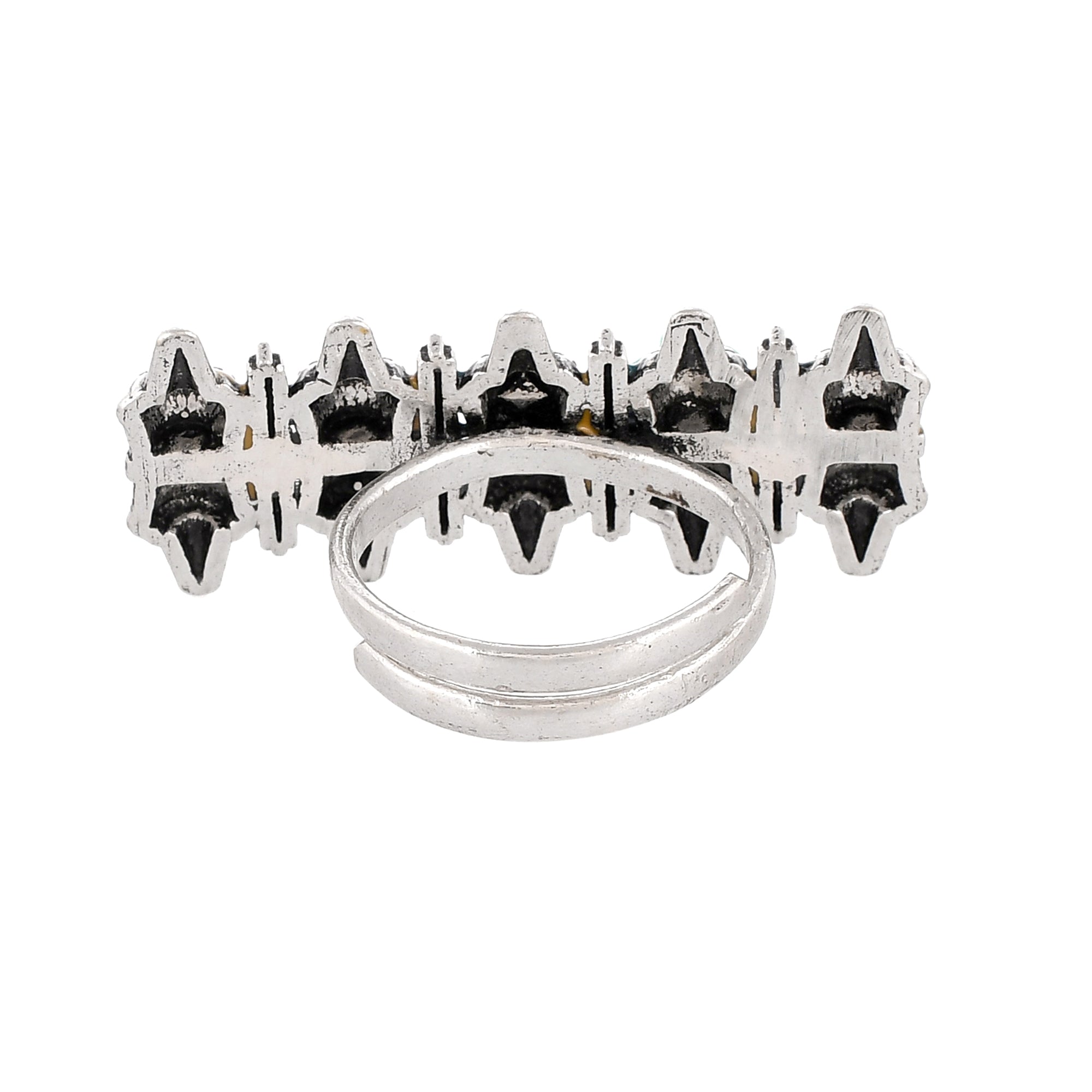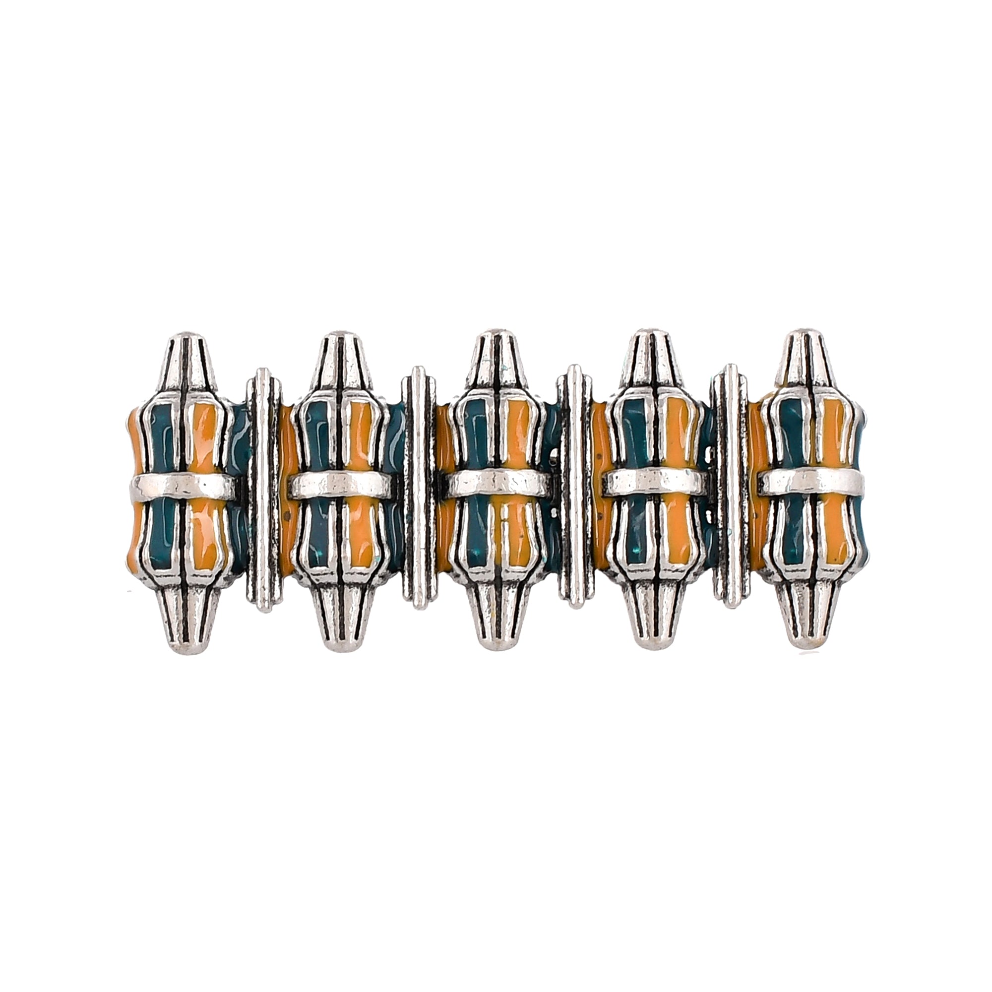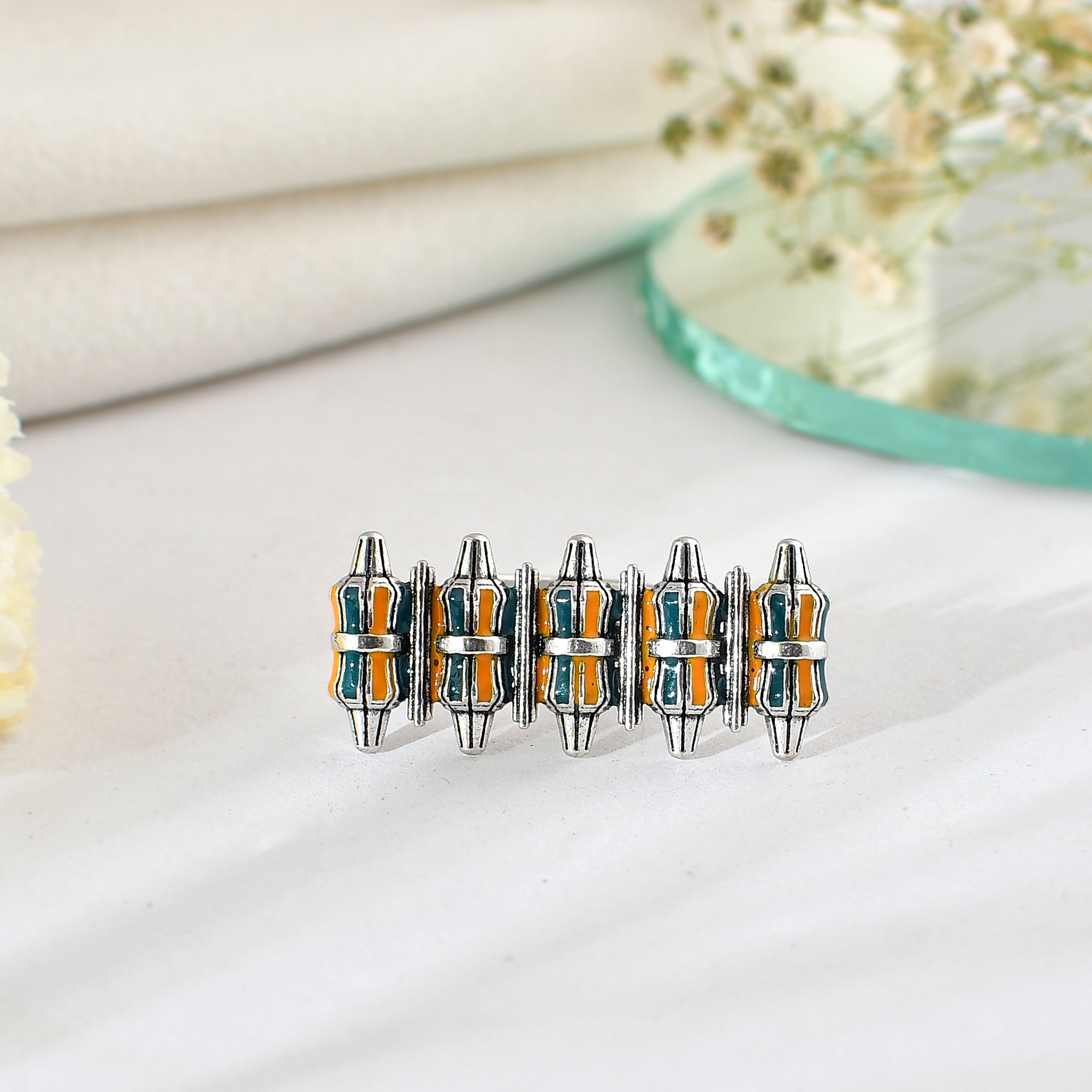 A rustic design ring with colorful enamel details, inspired by the African basket art of Zulu. Made from brass, the ring features oxidized silver plating and is adjustable for maximum comfort.